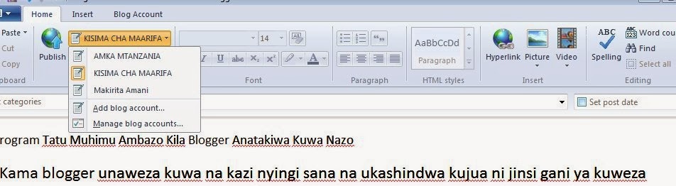 Faisa nyingine kubwa ya program hii ni kwamba unaweza kuitumia kuendesha blog zaidi ya moja. Kama unaendesha blogs nyingi unaweza zote kuziweka hapo na ukachagua ni ipi unataka kuiandika kwa wakati huo. Kama inavyoonekana kwenye picha hapo chini nimeweka blog tatu kwenye windows live, KISIMA CHA MAARIFA, MAKIRITA AMANI NA AMKA MTANZANIA ![]()