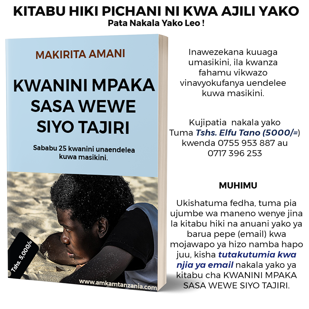 Pata kitabu BIASHARA NDANI YA AJIRA ujifunze jinsi unavyoweza kuanzisha na kukuza biashara yako, pia utajifunza mifereji nane(08) ya kipato unayopaswa kuwa nayo ili kufikia uhuru wa kifedha. Bonyeza maandishi haya kupata kitabu.