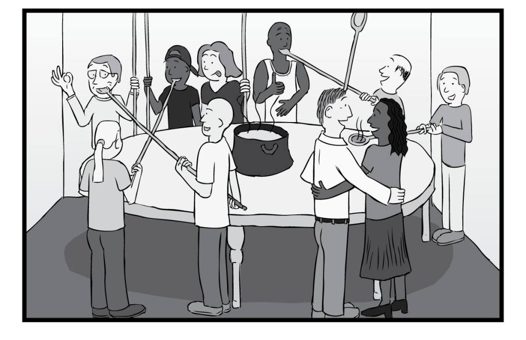 Bwana mmoja alifariki na alipofika ahera alipewa nafasi ya kwenda peponi au motoni. Kwa kuwa hakuwa na uhakika aliomba atembezwe sehemu zote mbili halafu atachagua ni wapi pa kwenda. Alipelekwa motoni akakuta watu wamekaa kwenye meza ya duara mbele yao kuna vyakula vizuri sana tunavyovipenda duniani. Ila hakuna aliyekuwa anakula na wote walikuwa wamekonda na hawana furaha kwa njaa kubwa waliyokuwa nayo.