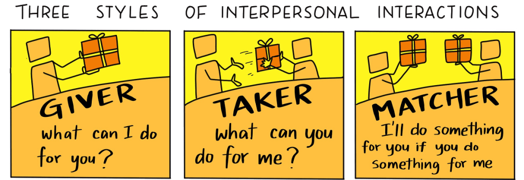 Aina ya kwanza ni wachukuaji (takers), hawa ni wale wanaochukua zaidi ya wanavyotoa ili kujinufaisha wao wenyewe zaidi. Hawa hujali maslahi yao kabla ya maslahi ya wengine. Hupata wanachotaka lakini baadaye sifa zao huharibika na kupoteza walichopata.