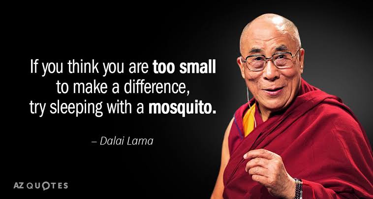 Kabla hujasema wewe ni mtu mdogo tu ambaye huna madhara kwenye dunia, nikukumbushe kauli ya Dalai Lama ambaye amewahi kusema kama unadhani ni mdogo sana na kuwezi kuleta mabadiliko, jaribu kulala na mbu kwenye chumba.