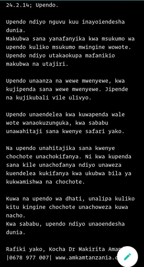 MAKALA PICHA 24.2.14; Upendo. Date: February 14, 2024Author: Dr. Makirita Amani 0 Comments Washirikishe wengine: Click to share on WhatsApp (Opens in new window) WhatsApp Click to share on Telegram (Opens in new window) Telegram Click to share on Facebook (Opens in new window) Facebook Click to share on X (Opens in new window) X Click to share on LinkedIn (Opens in new window) LinkedIn Like Loading... Related