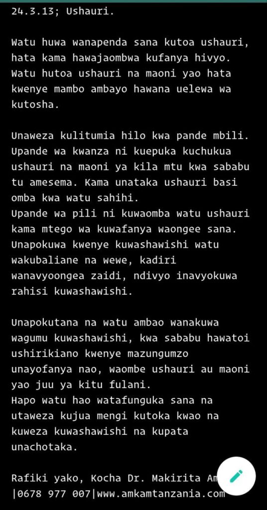MAKALA PICHA 24.3.13; Ushauri. Date: March 13, 2024Author: Dr. Makirita Amani 0 Comments Washirikishe wengine: Share on WhatsApp (Opens in new window) WhatsApp Share on Telegram (Opens in new window) Telegram Share on Facebook (Opens in new window) Facebook Share on X (Opens in new window) X Share on LinkedIn (Opens in new window) LinkedIn Like Loading... Related