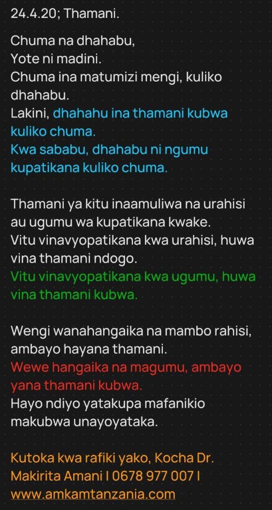 MAKALA PICHA 24.4.20; Thamani. Date: April 20, 2024Author: Dr. Makirita Amani 0 Comments Washirikishe wengine: Click to share on WhatsApp (Opens in new window) WhatsApp Click to share on Telegram (Opens in new window) Telegram Click to share on Facebook (Opens in new window) Facebook Click to share on X (Opens in new window) X Click to share on LinkedIn (Opens in new window) LinkedIn Like Loading... Related