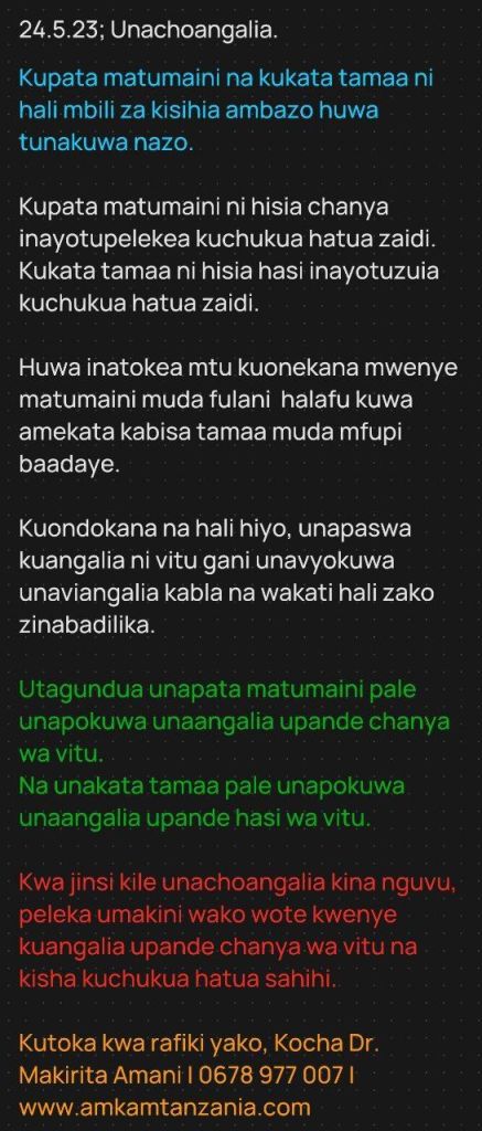 MAKALA PICHA 24.5.23; Unachoangalia. Date: May 23, 2024Author: Dr. Makirita Amani 0 Comments Washirikishe wengine: Share on WhatsApp (Opens in new window) WhatsApp Share on Telegram (Opens in new window) Telegram Share on Facebook (Opens in new window) Facebook Share on X (Opens in new window) X Share on LinkedIn (Opens in new window) LinkedIn Like Loading... Related