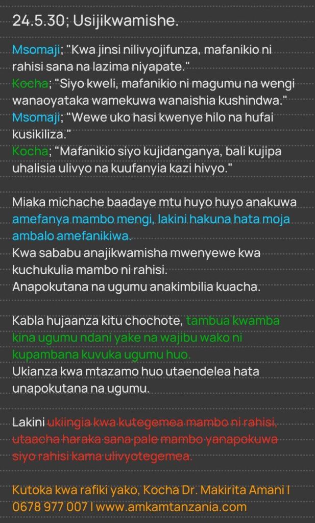 Usijikwamishe na kutafuta urahisi, jua yoyote makubwa ni magumu na yapambanie mpaka upate matokeo unayoyataka bila kukata tamaa.